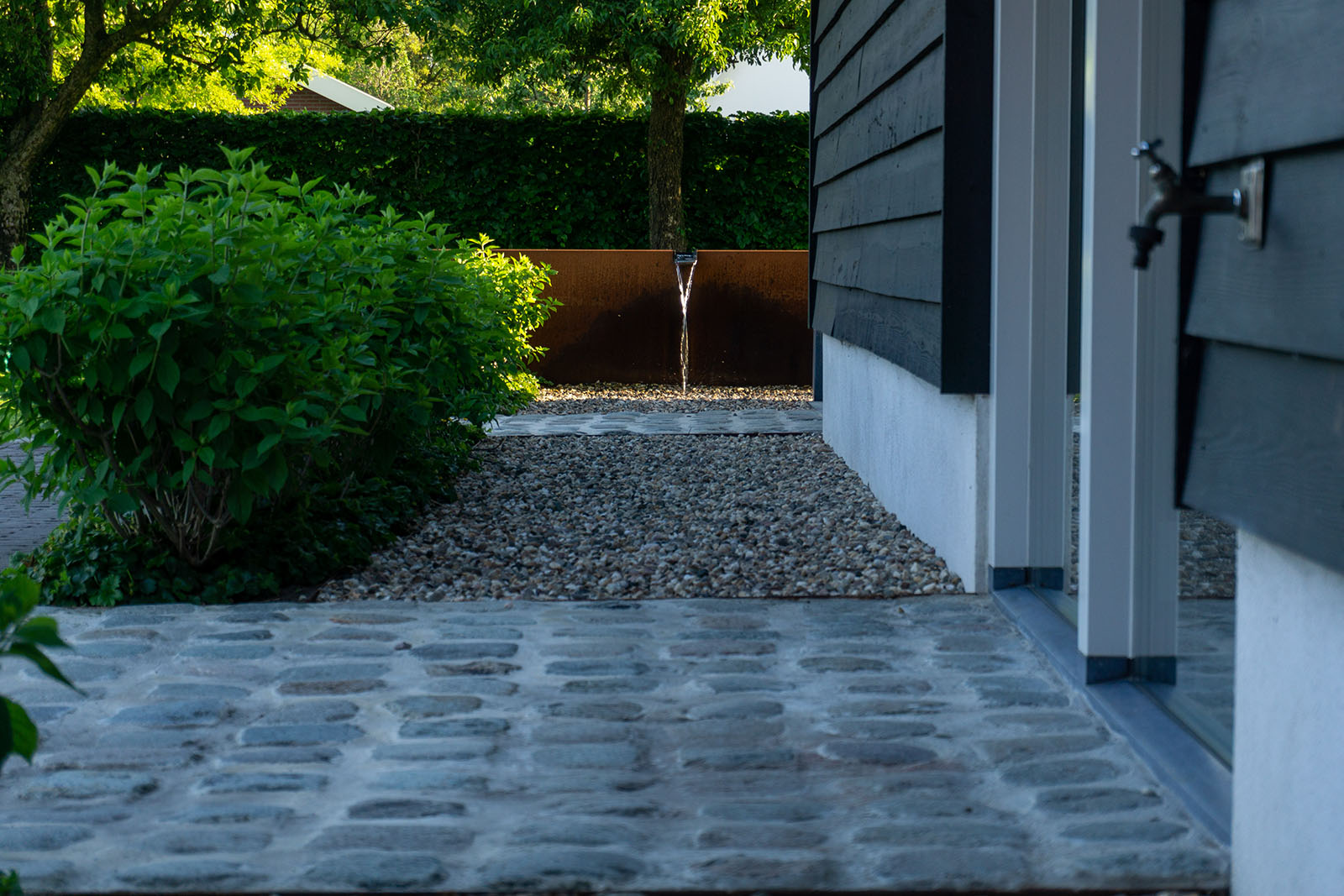 We beginnen met een kleine kers op de taart, een prachtige cortenstalen wand met een waterloop. Die een luxe afscheiding vormt tussen de patio en het gazon. De wand is specifiek voor deze tuin ontworpen en op maat gemaakt. Het zachtjes kletterende water geeft net dat extra beetje sfeer wanneer je geniet van een goed glaasje wijn op een zomeravond.